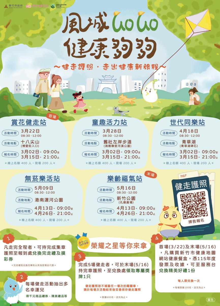 健走榮耀之星:集滿5場次護照章戳者,可於5/16末場(新竹公園)兌換限量「健走榮耀之星」專屬獎牌(限量 600 份)
